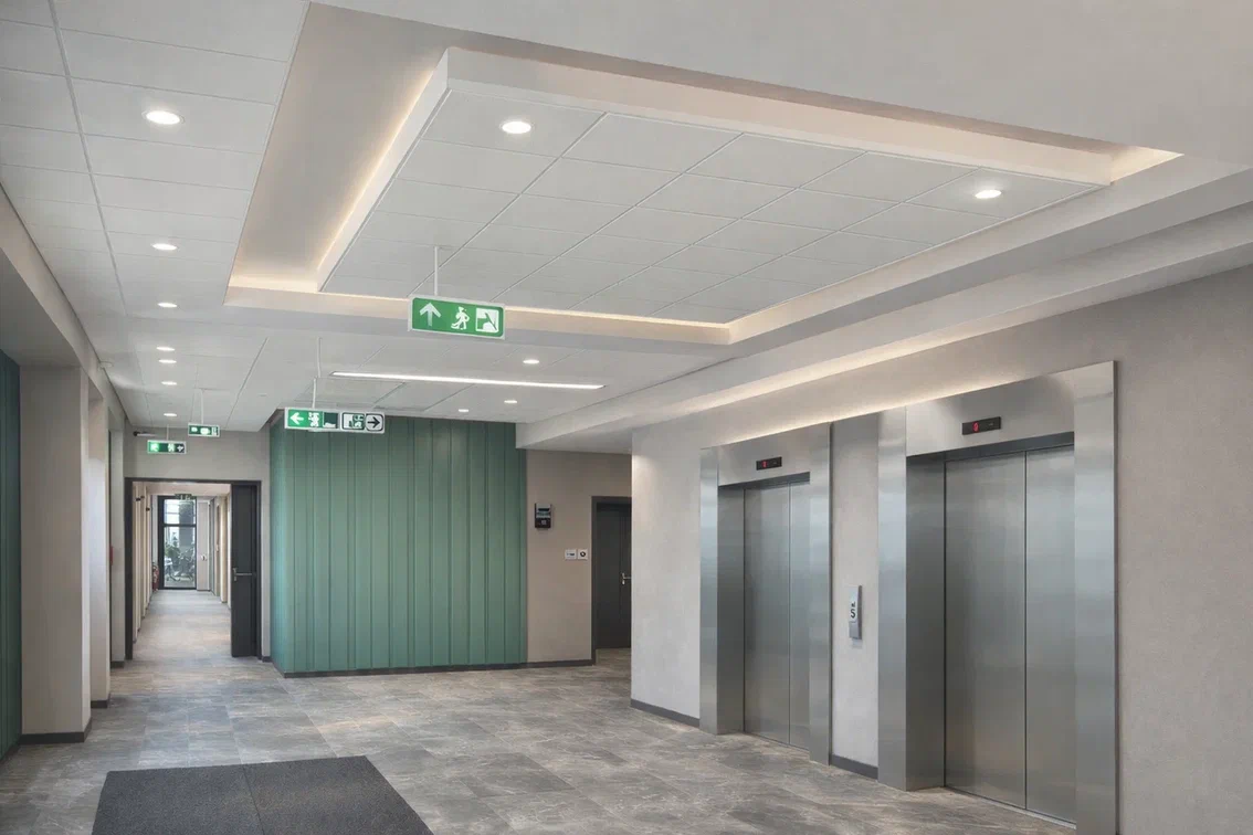 “У нас есть потолочные плиты из твердого минерального волокна, из мягкого, из металла. У нас есть широкий ассортимент своих подвесных систем и даже есть уникальные специальные системы, которые позволяют подвесить потолок там, где кажется, что это невозможно”, — поделился с коллегами Белов.
